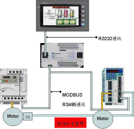 新型高速并條機(jī)采用全系列臺(tái)達(dá)機(jī)電一體化技術(shù)實(shí)現(xiàn)單一自動(dòng)化平臺(tái)工藝控制過程?刂葡到y(tǒng)框圖如圖2所示。項(xiàng)目由DVP60ES00R2型PLC負(fù)責(zé)控制全機(jī)的運(yùn)行,同時(shí)配備DOPA57GSTD或者DOPAS57BSTD型號(hào)觸摸屏,PLC與觸摸屏之間采用RS232方式通訊,運(yùn)用中文與圖形符號(hào)顯示產(chǎn)量.條速.轉(zhuǎn)速.定長(zhǎng).班次等參數(shù),并對(duì)出現(xiàn)的故障進(jìn)行實(shí)時(shí)顯示,使控制更加人性化,即利于全機(jī)的操作,也方便了管理,而PLC與伺服驅(qū)動(dòng)器以及E系列變頻器之間通過MODBUSRS485方式實(shí)現(xiàn)數(shù)據(jù)交換和通訊控制。