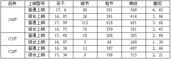 這一款組合上銷是在SX6833金屬上銷基礎(chǔ)上加裝組合鉗口活動(dòng)片,加長(zhǎng)上銷的鉗口面,達(dá)到控制細(xì)紗前區(qū)浮游纖維,增加其紗條的摩擦力界,縮短浮游區(qū)長(zhǎng)度,達(dá)到再次牽伸,以降低條干CV%值,減少粗細(xì)節(jié),解開由于纖維在運(yùn)動(dòng)中的摩擦、纏繞而產(chǎn)生的棉結(jié),達(dá)到提高成紗質(zhì)量,減少紗次疵的目的。該上銷在紡C40S、C32S、C28S紗支,特別是低配棉品種效果尤為明顯,通過長(zhǎng)期的紡紗實(shí)踐,在其條干細(xì)節(jié)、粗節(jié)、棉結(jié)各項(xiàng)指標(biāo)有大幅度提高,收到較好效果,其數(shù)據(jù)見下表: