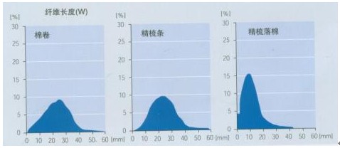 2.9、衡量一臺精梳機(jī)的好壞主要是考慮精梳機(jī)的產(chǎn)品質(zhì)量水平,從細(xì)絨棉在棉卷、精梳條及精梳落棉中的纖維長度的分布中,可看出短纖維的含量及紡紗質(zhì)量情況。圖1為特呂次勒TC01精梳機(jī)與標(biāo)準(zhǔn)精梳機(jī)的紡紗質(zhì)量的對比;圖2為纖維長度在條卷、精梳條及精梳落棉中的分布。