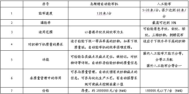 烏斯特驗布系統(tǒng)與人工驗布從目前生產實踐上看各有優(yōu)缺點(見表1),但從發(fā)展的眼光看,烏斯特自動驗布機將逐步隨著時間發(fā)展,顯示出更多的優(yōu)勢。