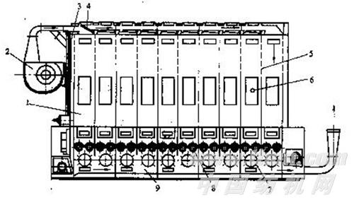 FA022型多倉混棉機的結(jié)構(gòu)如圖2-3-1所示,經(jīng)初步開松的原棉由輸棉風(fēng)機2送入輸送管道,經(jīng)活門4的開閉逐個進入儲棉倉1,氣流透過孔板5經(jīng)回風(fēng)道3進入混棉道9。當(dāng)棉倉內(nèi)的原料達(dá)到一定高度時,原料將倉前后隔板上部分網(wǎng)孔板5堵塞,該倉靜壓升高,當(dāng)氣壓升至某一定值時,微壓差開關(guān)控制氣動機構(gòu)關(guān)閉活門4,同時自動打開下一棉倉的活門,原料進入下一倉。如此順序喂料直到喂?jié)M最后一倉。在第二倉觀察窗上裝有光電管6,當(dāng)最后一倉喂?jié)M原料而第二倉原料存量低于光電管高度時,則喂料工作轉(zhuǎn)入第一倉,本機開始下一循環(huán)工作。當(dāng)光電管仍被原料遮住,則總活門關(guān)閉,直到原料低于光電管高度才重新開始喂棉。在各倉底部均有一對給棉羅拉8和一只打手7,原料經(jīng)開松后落入混棉通道9內(nèi)被前方氣流輸出。