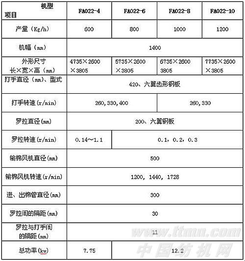 表2-3-1 FA022型多倉混棉機的主要技術(shù)特征