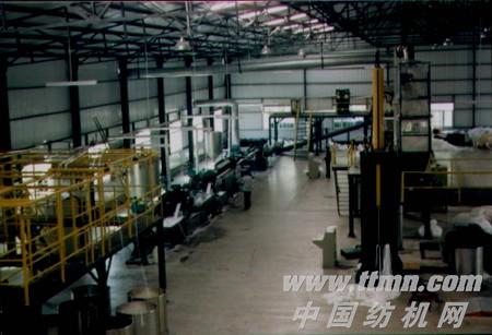 工藝流程 (前紡的絲束)→集束架→上導絲架→七輥導絲機→浸油槽→七輥牽伸機→水浴牽伸槽→第二七輥牽伸機→蒸汽牽伸箱→第三七輥牽伸機→上油機→卷曲機→抽濕機→①(三維卷曲中空纖維)→噴硅油機→張力機→切斷機→擺絲機→松弛熱定形機→風送系統(tǒng)→打抱機 ②(普通纖維→輸送機→擺絲機→松弛熱定形機→張力機→切斷機→風送系統(tǒng)→打包機 主要特點與用途 年產(chǎn)3000噸滌三維卷曲中空短纖維柔性生產(chǎn)線既能生產(chǎn)普通短纖維,又能生產(chǎn)三維卷曲中空短纖維。整個生產(chǎn)線由紡絲卷繞聯(lián)合機和后處理聯(lián)合機及公用工程三部分組成。經(jīng)各使用廠家長期生產(chǎn)證實:該生產(chǎn)線設計合理、運行可靠、工藝成熟、質(zhì)量穩(wěn)定。用它生產(chǎn)的絲束質(zhì)量達到了國標準,并接近國內(nèi)最好水平。