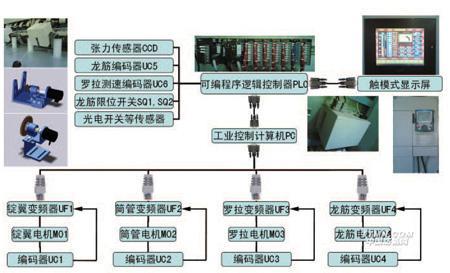 使用PLC+工控機(jī)的控制方式,通過四臺變頻器驅(qū)動,完成同步控制。實(shí)現(xiàn)粗紗捻度,粗紗密度和粗紗張力的便捷調(diào)整。