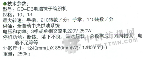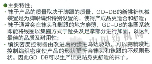 GD-DB型襪機(jī)是生產(chǎn)帶后跟五指襪的專業(yè)設(shè)備,以兩臺(tái)為一組,一臺(tái)專門生產(chǎn)左襪,另一臺(tái)編織右襪,以配合成一對(duì)帶后跟五指襪。