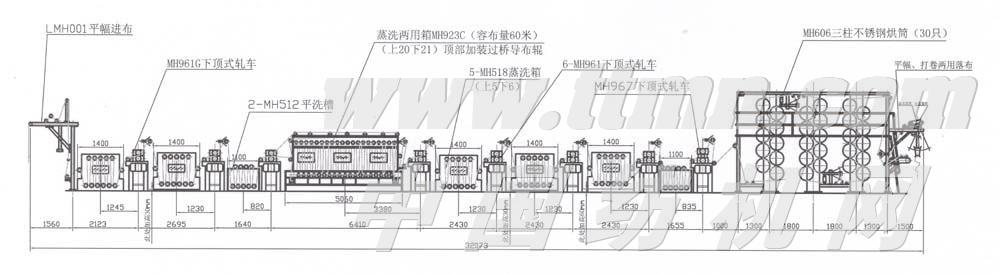 平幅進(jìn)布→MH518蒸洗箱→MH961G軋車→MH518蒸洗箱→MH961軋車→MH512平洗槽→MH961軋車→MH923C汽蒸箱→MH961軋車→MH518蒸洗箱→MH961軋車→MH518蒸洗箱→MH961軋車→MH518蒸洗箱→MH961軋車→MH512平洗槽→MH961軋車→MH606三柱烘燥機(jī)→平幅、打卷落布