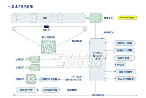 數(shù)字卷繞排線專用控制系統(tǒng)是針對紡紗卷繞設(shè)備的工藝特點開發(fā)的、多電機集成運動控制的系統(tǒng)級產(chǎn)品,高度集成了高速精密伺服、無刷直流、交流異步及步進電機驅(qū)動控制技術(shù),同時嵌入高速橫動導(dǎo)紗運動控制和卷繞張力控制算法,可廣泛應(yīng)用于精密卷繞的絡(luò)絲機、松式絡(luò)筒機、并紗機和空氣包覆機等紡紗卷繞設(shè)備的卷繞和橫動排線控制,實現(xiàn)高柔性化的數(shù)碼卷繞功能。 1. 結(jié)構(gòu)特點 *包含一個交流伺服電機(橫動排線)、一個無刷直流電機或交流異步電機(卷繞)和兩個步進電機的驅(qū)動與控制 *具備兩個模擬量信號輸出,用于調(diào)速電機和汽缸比例閥的控制,如松式絡(luò)筒需要的超喂電機和紗筒背壓力控制等 *具備兩個模擬量信號輸入,用于紗筒直徑和卷繞張力傳感器信號輸入 *具備RS485通信接口,用于單錠控制中擴展其他特殊功能電機的單錠調(diào)速控制,如超喂電機等 *具備CAN總線通信接口,用于設(shè)備現(xiàn)場總線,實現(xiàn)多錠聯(lián)網(wǎng) *具備多個輸入輸出接口,實現(xiàn)單錠啟停、斷紗傳感器信號輸入、電切刀和汽缸控制輸出等功能 2. 主要功能和技術(shù)參數(shù) *內(nèi)置高速精密卷繞和數(shù)碼分層卷繞控制工藝算法、 *卷繞比控制范圍2.000~12.000,控制精度到小數(shù)點后3位 *橫動排線的最大往復(fù)次數(shù)可達(dá)800次/分鐘,即每分鐘1600次換向 *具備動程自動找零功能,無需外接零位傳感器 *通過設(shè)置紗筒參數(shù),可實現(xiàn)圓柱形、梯形和錐形紗筒的卷繞 *卷繞比、往復(fù)動程長度、差動幅度、差動周期等工藝參數(shù)均可在設(shè)備人機界面上進行編輯,通過CAN總線通信傳送到指定站號的控制器,也可以由專用手持鍵盤編輯器編輯修改本地參數(shù) *具備多種紗筒成型補償曲線,如消除硬邊的差微曲線和梯形紗筒側(cè)面補償曲線等 *可實時顯示紗筒卷繞過程中的各種狀態(tài)參數(shù),如卷繞長度、紗筒直徑等 *多種故障保護措施,如參數(shù)異常、電機超速、動程超差、硬件故障等 單錠功能示意圖 系統(tǒng)示意圖