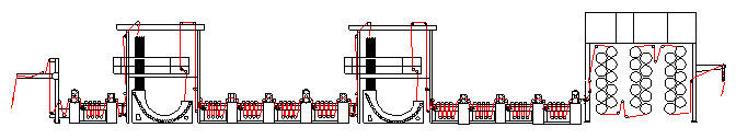 平幅進布→浸漬→三輥軋車→水洗→二輥軋車→J型箱→水洗→二輥軋車→水洗→二輥軋車→水洗→三輥軋車→水洗→二輥軋車→J型箱→水洗→二輥軋車→水洗→二輥軋車→水洗→ 二輥軋車→水洗→三輥軋車→烘燥→平幅落布