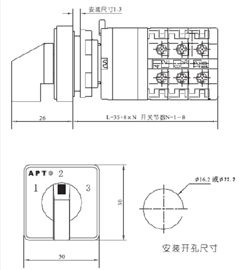 注(1)“←30°”表示把手柄操作到30位置時,手柄能自動復(fù)位到原來的位置。 注(2)“無限位°”表示開關(guān)沒有裝限們裝置,手柄可以任意旋轉(zhuǎn)到各位位置。 |