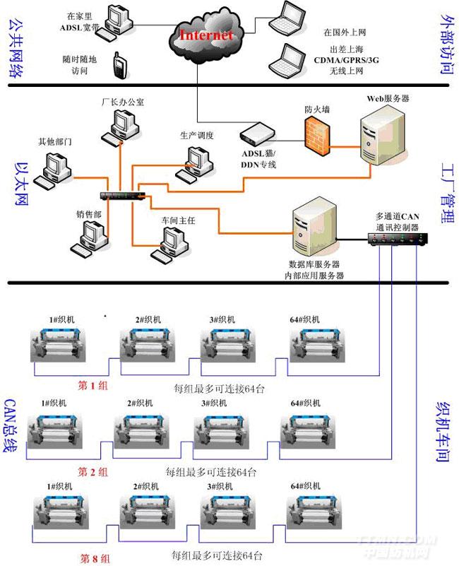 二、PsZJYB織機(jī)在線驗(yàn)布單元的組網(wǎng)。本單元可以用以太網(wǎng)或CAN總線組網(wǎng)運(yùn)行;針對(duì)該設(shè)備的網(wǎng)絡(luò)化管理我們分為3個(gè)層次,充分利用最新計(jì)算機(jī)控制技術(shù)和網(wǎng)絡(luò)技術(shù),組成一個(gè)完整而有效的網(wǎng)絡(luò)架構(gòu),為紡機(jī)企業(yè)的信息化提供真實(shí)和翔實(shí)的數(shù)據(jù); 完整的網(wǎng)絡(luò)架構(gòu)圖如下圖所示: