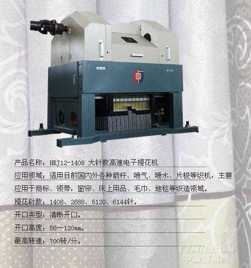 1408針電子大提花機(jī),整合了先進(jìn)的設(shè)計理念,結(jié)構(gòu)更優(yōu)化,功能更強(qiáng)大。適用目前國內(nèi)外各種箭桿、噴氣、噴水、片梭等織機(jī),主要應(yīng)用于商標(biāo)、領(lǐng)帶,窗簾、床上用品、毛巾、地毯等織造領(lǐng)域。