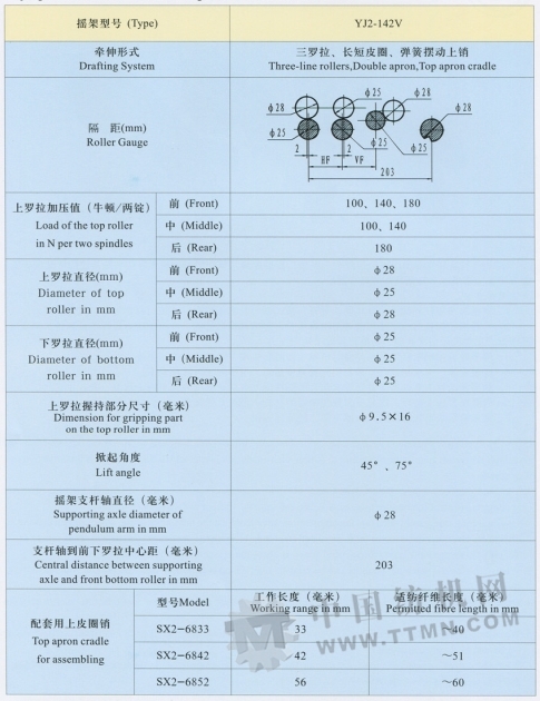 YJ2一142V搖架足三羅拉雙皮圈V型牽伸型式細紗機的一種牽伸加壓裝置,對粗紗進行進一步的牽伸??蓪w維長度在60毫米以下的各種棉纖維化學纖維進行純紡和混紡。