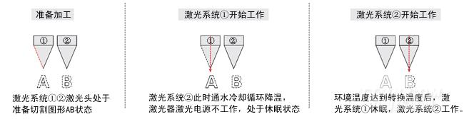 激光系統(tǒng)①②由控制系統(tǒng)根據(jù)環(huán)境溫度和加工時(shí)間等參數(shù)自主控制,使用兩個(gè)激光系統(tǒng)均處于最佳工作狀態(tài),兩個(gè)系統(tǒng)工作同時(shí)得到充分冷卻輪換休眠,在這樣原理下,激光機(jī)中激光器和電源壽命可延長3-5倍以上。