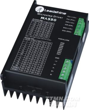 MA550驅(qū)動器,可采用交直流輸入,主要驅(qū)動57、86型兩相混合式步進電機。其微步細分數(shù)有16種,最大步數(shù)為51200Pulse/rev;其工作峰值電流范圍為1.0A-5.0A,輸出電流共有8檔,電流的分辨率約為0.5A;具有自動半流,過壓、過流保護等功能。本驅(qū)動器為交直流供電,建議工作電壓范圍為18VAC-30VAC,電壓不超過36VAC,不低于16VAC。
