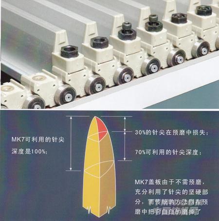 MK7蓋板由于不需預磨,充分利用了針尖的堅硬部分,而傳統(tǒng)的方法則在預磨中把它白白的磨掉了。
