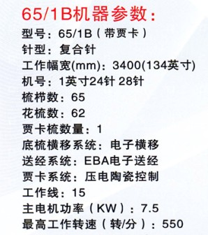 65/1B花邊機(jī)具有國內(nèi)目前頂級技術(shù)的多梳與賈卡結(jié)合的多梳經(jīng)編機(jī)。其特點(diǎn)如下:1.采用最先進(jìn)壓電陶瓷賈卡與新型的鋼絲多梳技術(shù)復(fù)合,機(jī)器性能更加穩(wěn)定可靠。2.采用賈卡形成多變的底布花式,具備獨(dú)特的底布風(fēng)格。3.地梳采用EBA電子送經(jīng),以及電子牽拉和卷布,且電腦操作方便簡潔,界面清晰。4.先進(jìn)的鋼絲多梳輕便可靠,使花型圖案更加清晰。5.花梳的獨(dú)特單卡控制補(bǔ)償,確保了花梳運(yùn)行的高精度。