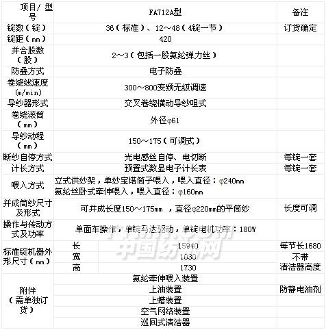 FA712A型并紗機(jī)可將各種適于軸向退繞的短纖紗或長絲的單紗并合成雙股或三股(其中可包括一股牽伸喂入的氨綸彈力絲)供倍捻、捻線用。