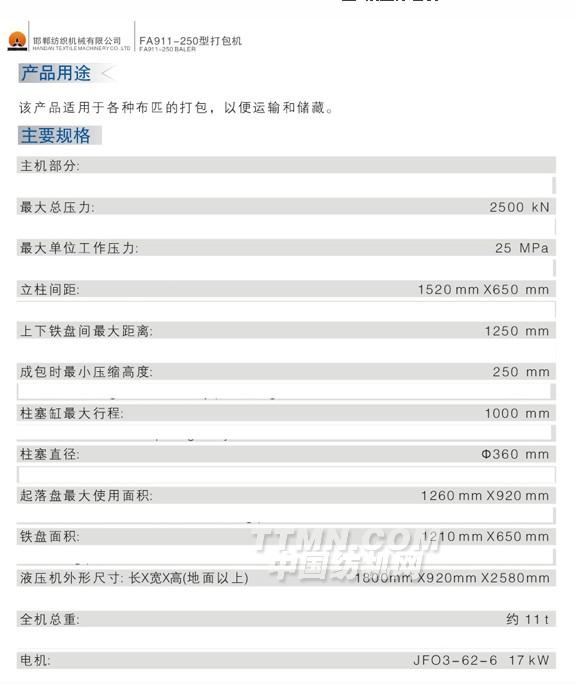 您所在的位置:紡機(jī)網(wǎng) > 產(chǎn)品庫(kù) > FA911-250型 液壓打包機(jī)