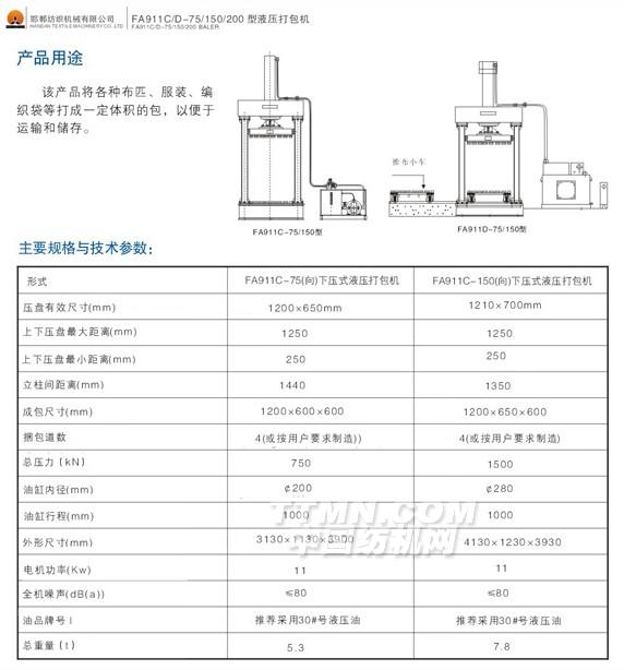 您所在的位置:紡機網 > 產品庫 > FA911C-75.150 型液壓打包機