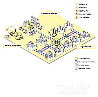 網(wǎng)絡(luò)的另一個(gè)功能是控制系統(tǒng),透過染廠網(wǎng)絡(luò)使流程之間相互調(diào)節(jié)和發(fā)揮最佳效能。還可聯(lián)系訂單管理到機(jī)器的控制單元上,從而組成一個(gè)完整的染廠網(wǎng)絡(luò)。