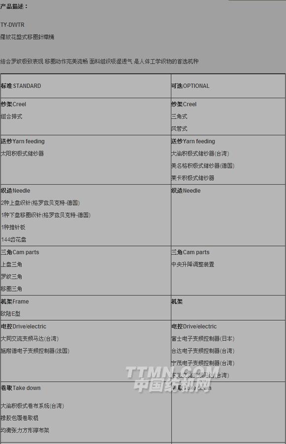 您所在的位置:紡機(jī)網(wǎng) > 產(chǎn)品庫(kù) > 羅紋花盤式移圈針織機(jī)TY-DWTR