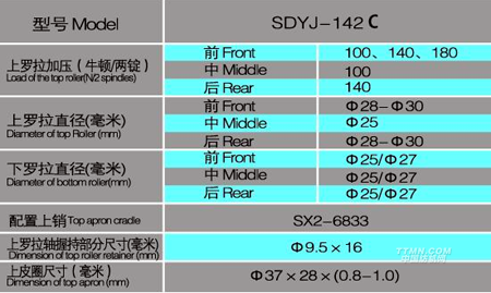 SDYJ2-142C型搖架適用于各型環(huán)錠紡細紗機,采用三羅拉雙皮圈平面牽伸形式,適應于纖維長度60毫米以下的純棉、 人造纖維及其合成纖維。采用單區(qū)牽伸形式時,可紡纖維長度120毫米。