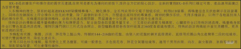 您所在的位置:紡機(jī)網(wǎng) > 產(chǎn)品庫(kù) > BX-D-GJ雙面花盤提花針織圓緯機(jī)