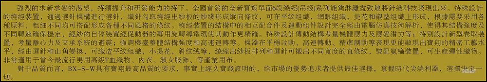 您所在的位置:紡機(jī)網(wǎng) > 產(chǎn)品庫(kù) > BX-S-W單面6段繞經(jīng)針織圓緯機(jī)