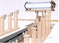 這是作為FA裝置的一環(huán), 在并軸機的經(jīng)軸架上裝卸經(jīng)軸的裝置。配備有油壓升降機的運軸架在鋪設(shè)的軌道上自動行走, 在預(yù)先設(shè)定的經(jīng)軸架位置上自動裝卸經(jīng)軸。為達到省力化和提高作業(yè)效率做出了貢獻。