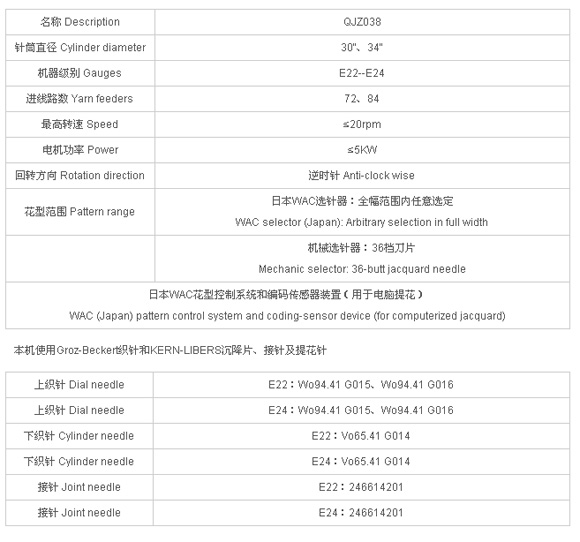 本機(jī)是雙面提花圓緯機(jī)。各選針器(機(jī)械選針或電子選針)使織針呈成圈、集圈、浮線等狀態(tài),可編織以羅紋和雙羅紋為基礎(chǔ)的各類提花組織及復(fù)合組織等坯布。選配氨綸裝置,可生產(chǎn)高彈力織物。采用新型通用機(jī)架(二項(xiàng)發(fā)明專利,二項(xiàng)實(shí)用專利)和進(jìn)口鋼絲軸承。
