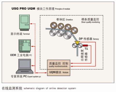 在線檢測功能(選用):本機(jī)可選用USTER? SLIVERGUARD PRO/第二代在線棉條質(zhì)量管理系統(tǒng)。該系統(tǒng)可隨機(jī)統(tǒng)計(jì)1m,3m,10m的重量不勻率,及CV%,A%等,可隨時(shí)查看和記錄波譜圖,根據(jù)用戶需要選擇超標(biāo)自停或者超標(biāo)報(bào)警,并顯示停車原因或報(bào)警原因,從而有利于質(zhì)量控制與分析,減少試驗(yàn)工勞動(dòng)強(qiáng)度。