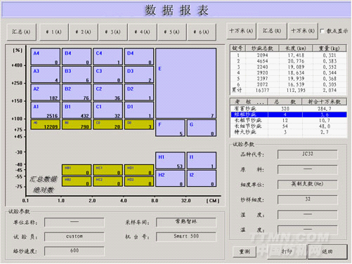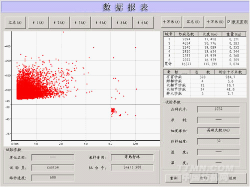 ● 其他數(shù)據(jù):顯示單錠或匯總的疵點(diǎn)總數(shù),實(shí)際測(cè)試長(zhǎng)度,折合紗線重量。