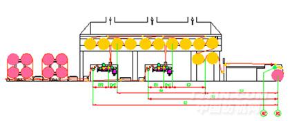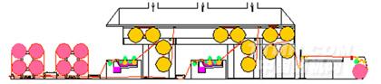 ASGA365E型漿紗機(jī)工藝流程示意圖(高架對(duì)角布局預(yù)烘烘燥機(jī)構(gòu)+雙浸四壓式上漿機(jī)構(gòu))