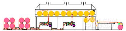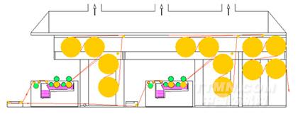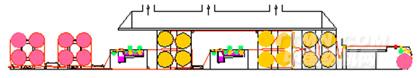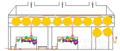 采用高架對(duì)角布局預(yù)烘烘燥機(jī)構(gòu)(專利號(hào): )。由于預(yù)烘烘筒位于漿槽的側(cè)上方,有效減少了出漿槽濕紗長(zhǎng)度,同時(shí)節(jié)省了設(shè)備安裝場(chǎng)地。