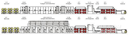 本系列漿染聯(lián)合機主要是為了適應于靛藍、硫化等直接染料對5~32S純棉及其混紡織物的經(jīng)紗冷、熱染、套色及上漿,具有連續(xù)漂、染、漿的特點。