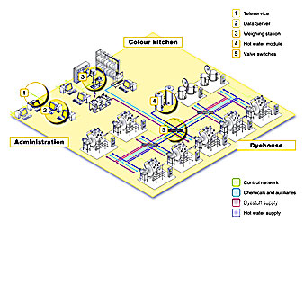 網(wǎng)絡(luò)的另一個功能是控制系統(tǒng),透過染廠網(wǎng)絡(luò)使流程之間相互調(diào)節(jié)和發(fā)揮最佳效能。還可聯(lián)系訂單管理到機器的控制單元上,從而組成一個完整的染廠網(wǎng)絡(luò)。