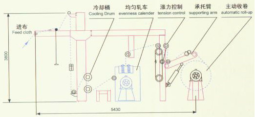 本機有進布機架,冷卻桶,均勻軋車,漲力控制器,承托臂,主動收卷等組成。