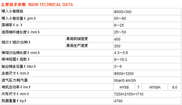 HY68型精梳機(jī)是我公司在吸收國內(nèi)外先進(jìn)技術(shù)的基礎(chǔ)上自行設(shè)計研制開發(fā)的新型棉紡設(shè)備,HY68A型精梳機(jī)又是在HY68型精梳機(jī)的基礎(chǔ)上進(jìn)一步提高了機(jī)電一體化及自動化程度。該機(jī)具有高速高產(chǎn)、梳理效果好、噪音低、操作簡單、能耗低、機(jī)電一體化程度高等優(yōu)勢,是進(jìn)行精梳工藝的良好設(shè)備。