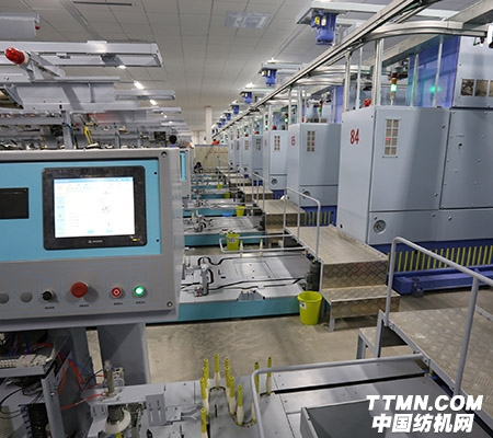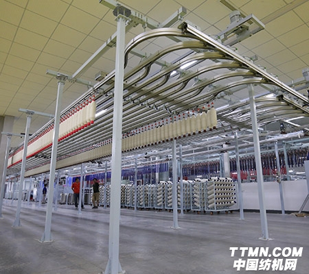 生產(chǎn)線主要由:清梳聯(lián)、異性纖維分檢機(jī)、高產(chǎn)梳棉機(jī)、精梳機(jī)、自調(diào)勻整并條機(jī)、自動(dòng)落紗粗紗機(jī)、粗紗輸送系統(tǒng)、集體落紗細(xì)紗機(jī)及細(xì)絡(luò)聯(lián)型絡(luò)筒機(jī)等部分組成。其中粗細(xì)絡(luò)聯(lián)系統(tǒng)實(shí)現(xiàn)了粗紗、細(xì)紗、絡(luò)筒三個(gè)工序的自動(dòng)化聯(lián)接。粗紗機(jī)自動(dòng)落紗后,通過(guò)粗紗機(jī)空滿管交換裝置將滿筒粗紗輸送到粗細(xì)聯(lián)軌道上,采用電機(jī)驅(qū)動(dòng)鏈桿式滑車方式,將滿筒粗紗送至細(xì)紗機(jī),或?qū)⒋旨喛展軓募?xì)紗機(jī)送回粗紗機(jī)。系統(tǒng)完成粗紗、滿紗、空管等空中運(yùn)輸,節(jié)省紡織廠占地空間,優(yōu)化車間布局,減少操作工的勞動(dòng)強(qiáng)度。