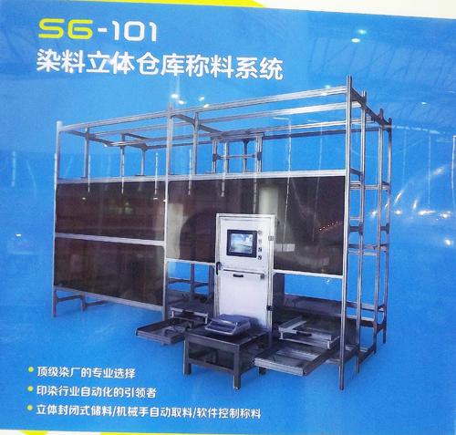 傳統(tǒng)的染料配料間,往往需要占用大量的空間來(lái)存放染料,其環(huán)境的好壞對(duì)人的依賴性大,取料效率也相當(dāng)?shù)拖?。立體式倉(cāng)儲(chǔ)稱料系統(tǒng)正是為解決這些問題而研發(fā)的。它使用貨架來(lái)存儲(chǔ)染料充分利用空間;配備機(jī)械臂自動(dòng)取料,使取料過(guò)程更準(zhǔn)確、快捷;稱料過(guò)程由電腦控制,減少了染料浪費(fèi)提高了稱料的準(zhǔn)確性。讓經(jīng)營(yíng)者能進(jìn)一步加強(qiáng)對(duì)配料間的管理和原料成本的控制。