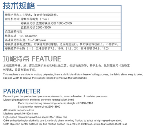 公司生產(chǎn)的ZXH918型節(jié)能高速絲光機,具有絲光檔次高,具有高速、高效、節(jié)能、環(huán)保,絲光鋇值高,門幅穩(wěn)定等特點。目前暢銷市場,定型機也是我公司的龍頭產(chǎn)品,應用廣泛。且我公司營銷、售后服務遍布全國各地,已有大量印染廠家訂購,具有廣闊的市場前景。