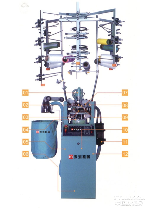 “禾潤(rùn)”牌HRA04MJ、HRB04MJ型絲襪機(jī)是由電腦控制的具有四路標(biāo)志系統(tǒng)的單針筒提花絲襪機(jī)。該機(jī)采用獨(dú)立抽風(fēng)機(jī)或中央抽風(fēng)系統(tǒng)進(jìn)行織物牽拉,機(jī)器配備抗扭裝置。針筒轉(zhuǎn)動(dòng)采用伺服電機(jī)直接驅(qū)動(dòng)以減少轉(zhuǎn)動(dòng)鏈及傳動(dòng)誤差,由3個(gè)步進(jìn)馬達(dá)控制生克眉毛以及控制針筒升降,可產(chǎn)生不同疏密、加壓潤(rùn)滑油用以潤(rùn)滑針織、生克和選針片。HRA04Mj可分段打松、HRB04MJ可局部打松。電腦控制襪子的制作全過(guò)程、款式和品質(zhì)。為使提花達(dá)到最佳效果喂紗梭采用橫向移動(dòng),使面紗、底紗、色紗達(dá)到最佳入緯角度。該機(jī)可使用合成纖維、人造纖維以及裸氨綸和包覆紗等原料生產(chǎn)絲襪產(chǎn)品,主要生產(chǎn)短襪、長(zhǎng)筒襪、連褲襪等襪子類型。