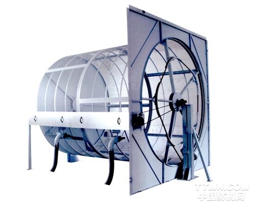 含塵空氣從轉(zhuǎn)籠外向轉(zhuǎn)籠內(nèi)流動.將其中的塵雜截留在過濾材料上,潔凈空氣則從轉(zhuǎn)籠內(nèi)通過其敞開端流出墻板(或方箱)。墻板(或方箱)外有風機將潔凈空氣抽出。