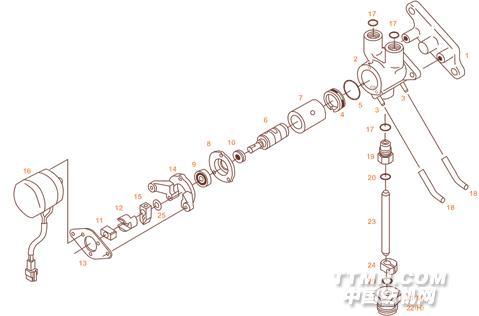 (1)閥基座(2)閥體(3)銅管(4)閥帽 (5)O型圈(6)選擇轉(zhuǎn)子 (7)閥SI (8)軸承座 (9)滾珠軸承 (10)V-型圈(11)轉(zhuǎn)矩臂(12)十字聯(lián)軸節(jié)(13)螺線管固定片 (14)螺線管支架 (15)連接器(16)交叉旋轉(zhuǎn)螺線管 (17)O型圈(18)乙烯基管(19) 管子連接器 (20)O型圈 (21)管子連接器(M)(22)管子連接器(H) (23)輸出管 (24)管子固定器 (25)墊圈 |