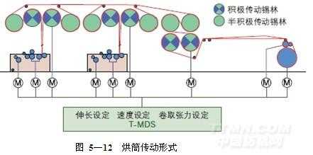 ②預(yù)烘筒、主烘筒的傳動(dòng),通過積極傳動(dòng)和半積極傳動(dòng)方式組合,通過新烘筒傳動(dòng)方式及新溫度調(diào)節(jié)系統(tǒng)提高烘干性能。使各種紗支的伸長率等得到控制,上漿、烘干率也比原來的機(jī)型有所提高(見圖 5—12);