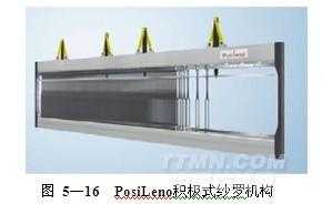 a.采用 Groz-Beckert公司新推出的 PosiLeno®積極式控制紗羅系統(tǒng),通過綜框運(yùn)動帶動全幅紗羅 (圖 5—16)。過去消極式紗羅織造機(jī)構(gòu)將紗羅綜片安裝在綜框上,由綜框傳動、彈簧回綜,結(jié)構(gòu)簡單、運(yùn)動時沖擊大 (圖 5—17),只能適應(yīng)較低的織造速度。新型的 PosiLeno積極式紗羅機(jī)構(gòu)將紗羅綜片安裝在 1片綜框上,另一片綜框通過鉸接的連桿傳動紗羅綜片。這種結(jié)構(gòu)適應(yīng)更高的織造速度,生產(chǎn)效率成倍提高,為劍桿織機(jī)織造紗羅織物提供了簡單易用的方案;