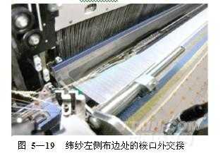 ONE S 200 N 8 SP是1臺很有特點的劍桿織機(jī),最先在西班牙巴塞羅那的 ITMA 2011上展出,它采用了由 SMIT公司最新研發(fā)的 Smit One Gripper System(SOGS)單劍頭引緯交接系統(tǒng),左側(cè)送緯側(cè)無劍帶,送緯劍安裝在 1個短軸上,此軸由伺服電機(jī)驅(qū)動。右側(cè)接緯劍由傳統(tǒng)的機(jī)械引緯機(jī)構(gòu)和傳劍輪、劍帶驅(qū)動。引緯時送緯劍夾住緯紗后前進(jìn)至靠近左側(cè)布邊處,此時接緯劍穿越整個梭口,在靠近左側(cè)布邊的梭口外完成緯紗交接并返回,完成引緯 (圖 5—19)。緯紗交接在梭口外完成,送緯劍不進(jìn)入梭口,而接緯劍頭的橫截面積大大小于送緯劍,因此梭口可以開得更小些。根據(jù) SMIT公司介紹,同傳統(tǒng)的雙側(cè)引緯、中央交接的引緯方式相比,“ONE”可減小經(jīng)紗開口幅度,能夠適應(yīng)各種類型的緯紗和織物,如復(fù)雜的精細(xì)織物、時裝面料、裝飾織物、安全防護(hù)織物、電路板玻纖織物、工業(yè)濾布、運動服面料等。同時,采用單側(cè)引緯、不在梭口中央進(jìn)行緯紗交接,還有其他一些優(yōu)點: