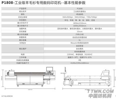 P1808工業(yè)級高速平板數(shù)碼印花機(jī)具有自動刮墨、自動保濕和小車自動升降等功能,產(chǎn)品大氣美觀、加工細(xì)膩、結(jié)構(gòu)合理。擁有超寬幅打印平臺1890X2920mm,有效打印幅寬1850X2250mm,適應(yīng)多種國內(nèi)外規(guī)格的毛衫裁片加工。最大分辨率1080dpi,具有360x360dpi、360x540dpi、360x720dpi等工作模式,生產(chǎn)效率高達(dá)25件/小時(shí)。采用絲桿傳動方式,步進(jìn)精度高,提高打印質(zhì)量。