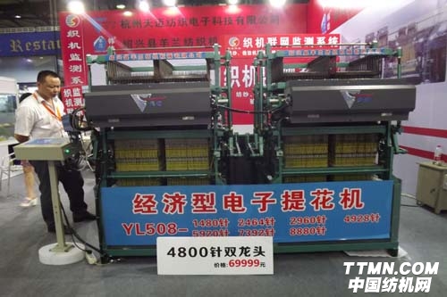 為提高國(guó)產(chǎn)有梭織機(jī)和劍桿織機(jī)大提花性能,杭州天邁紡織電子科技有限公司在設(shè)計(jì)電子提花機(jī)特別是在織造大提花織物時(shí)可不使用紙花板,實(shí)現(xiàn)電子大提花。本次展出的4800針電子花枕就是很好的說(shuō)明。該產(chǎn)品無(wú)需紙板,只要花形文件輸入,節(jié)省成本可算而知。配置天邁核心技術(shù),不僅提高了生產(chǎn)效率,而且還為客戶提供樣品,花形寫(xiě)好即可打樣。同時(shí)節(jié)約電能,電子花枕功率不到100W--200W。