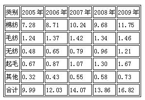 “十二五”期間無(wú)紡、起毛等領(lǐng)域?qū)⒀永m(xù)較快發(fā)展的態(tài)勢(shì),增長(zhǎng)速度將高于棉紡毛紡行業(yè),預(yù)計(jì)各領(lǐng)域未來(lái)五年對(duì)針布的需求年增長(zhǎng)率為棉紡9%~ 10%、毛紡5%~ 6%、無(wú)紡18%~ 22%、起毛16%~ 20%,其他領(lǐng)域?yàn)?0%~ 15%。“十二五”期間針布整體需求量的年增長(zhǎng)速度為10%~ 14%。
